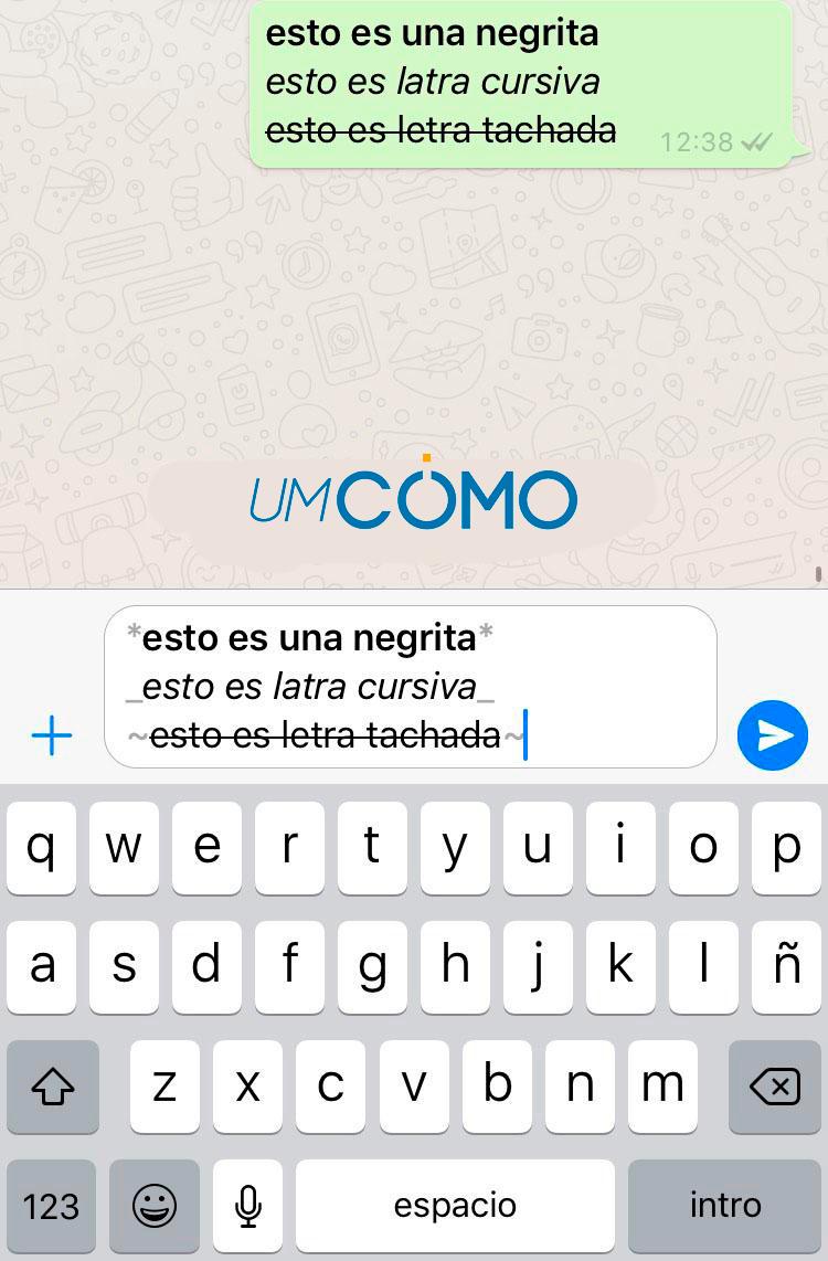 Outro jeito interessante de personalizar o texto ou o recado no Whatsapp é mudar as letras convencionais para letras em negrito, itálico ou palavras riscadas. Para tal, temos que inserir uma série de símbolos entre parênteses na parte do texto que desejamos alterar. Assim, pode-se usar um asterisco para colocar o trecho em negrito, o traço baixo (ou underline) para que o texto mude para itálico, e o til para que a palavra fique riscada (ou tachada).