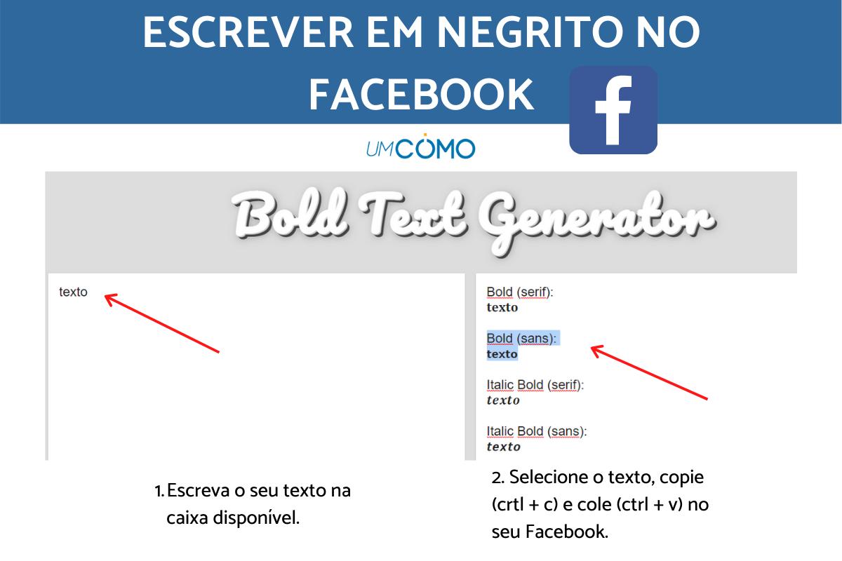 Ao escrevermos textos, por vezes consideramos um trecho importante e queremos deixar clara sua relevância. Assim, existem algumas ferramentas que podemos utilizar para que informações específicas chamem a atenção. Uma das opções para dar destaque é o uso do negrito, que deixa os traços das letras mais grossos, fazendo com que se destaque no meio do texto. Se nosso texto for redigido em plataformas específicas para essa função como programas como o Word, é necessário apenas selecionarmos o texto e clicar no botão que transforma os textos em negrito, mas e se estamos escrevendo algo em uma rede sociais como o Facebook, o que devemos fazer para alterar as configurações do texto?