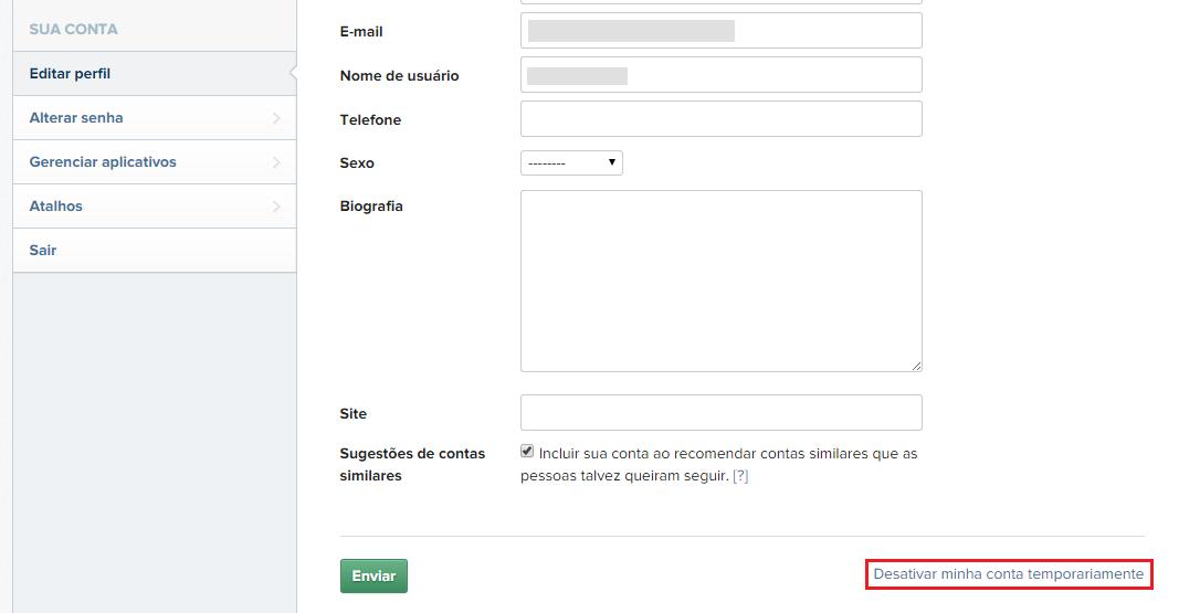 Agora na nova aba deverá selecionar a opção de "Editar perfil" no menu da esquerda. Depois faça scroll para baixo e clique em "Desativar minha conta temporariamente".