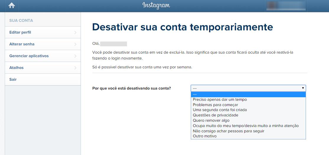 Por último, deverá selecionar um motivo para estar desativando a sua conta do Instagram e confirmar esta ação. Só é possível desativar a sua conta uma vez por semana.