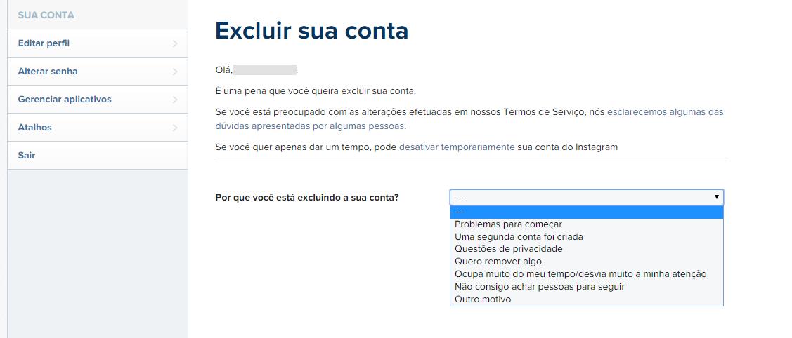 Mas se a sua intenção é excluir definitivamente a sua conta do Instagram e eliminar as suas fotos, comentários e curtidas também há uma forma de fazê-lo. Selecione o motivo que o levou a eliminar a sua conta do Instagram e confirme esta ação. É importante lembrar que, ao fazer isto você não conseguirá recuperar a sua conta ou se cadastrar novamente com o mesmo nome de usuário. Por isso, se você não tem completamente a certeza de que excluir a sua conta seja o que quer, então desative a sua conta do Instagram por um tempo para refletir sobre o assunto.