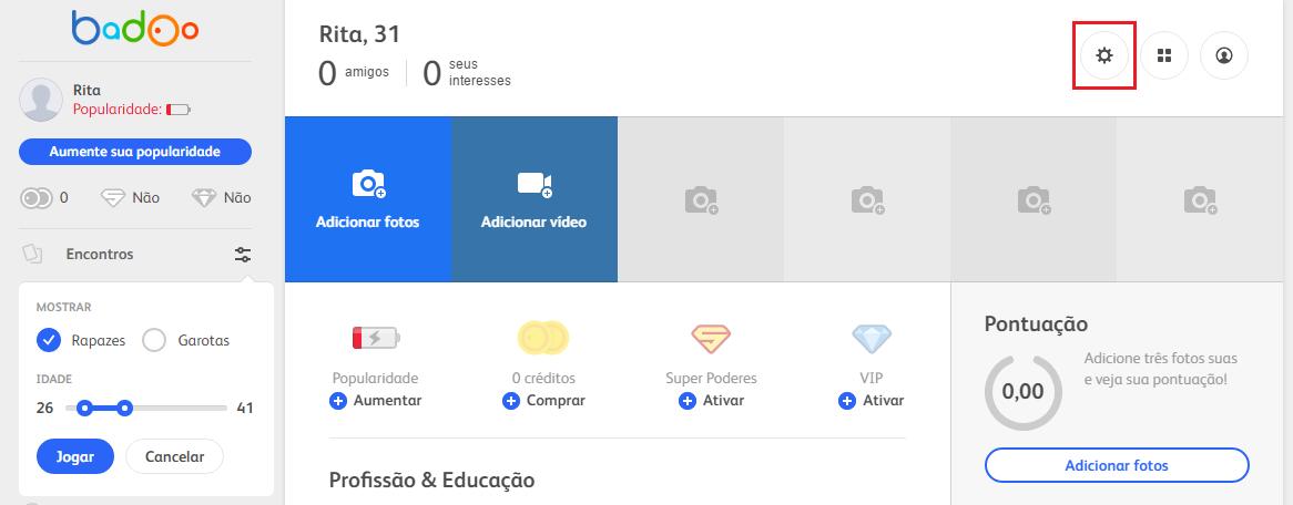 Para excluir sua conta do Badoo, comece por acessar sua conta. Uma vez no seu perfil do Badoo, clique na roda dentada que se encontra no canto superior direito para acessar às Configurações.