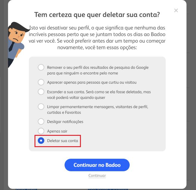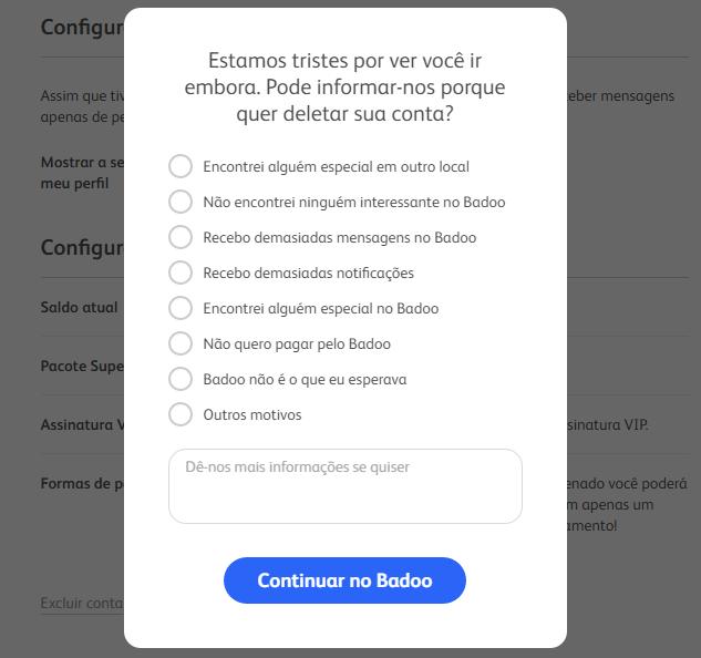 Depois será exibida uma lista para você selecionar o motivo da sua saída do Badoo, selecione a opção que pretende e clique em "Continuar".