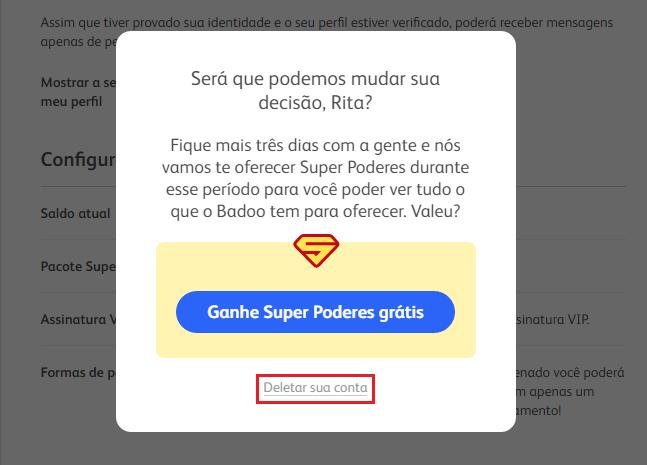 De seguida, será exibida uma nova tela com uma recomendação para Ganhar Super Poderes grátis por 3 dias, ignore isso e clique em "Deletar sua conta".