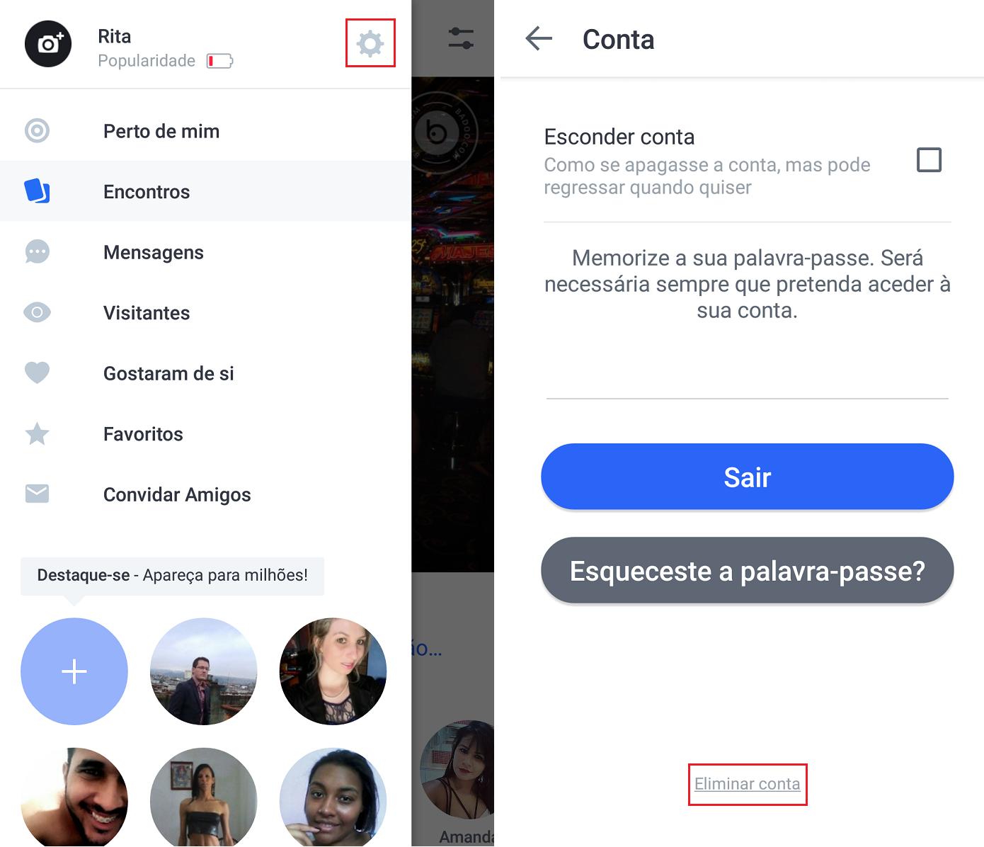 No aplicativo da rede social o procedimento para excluir a conta é bastante idêntico, mas para não ficar com dúvidas vamos explicar todos os passos. Abra o app do Badoo e clique no ícone dos três traços horizontais no canto superior esquerdo. Clique na roda dentada em cima, selecione a opção "Conta" e depois "Eliminar conta" em baixo.