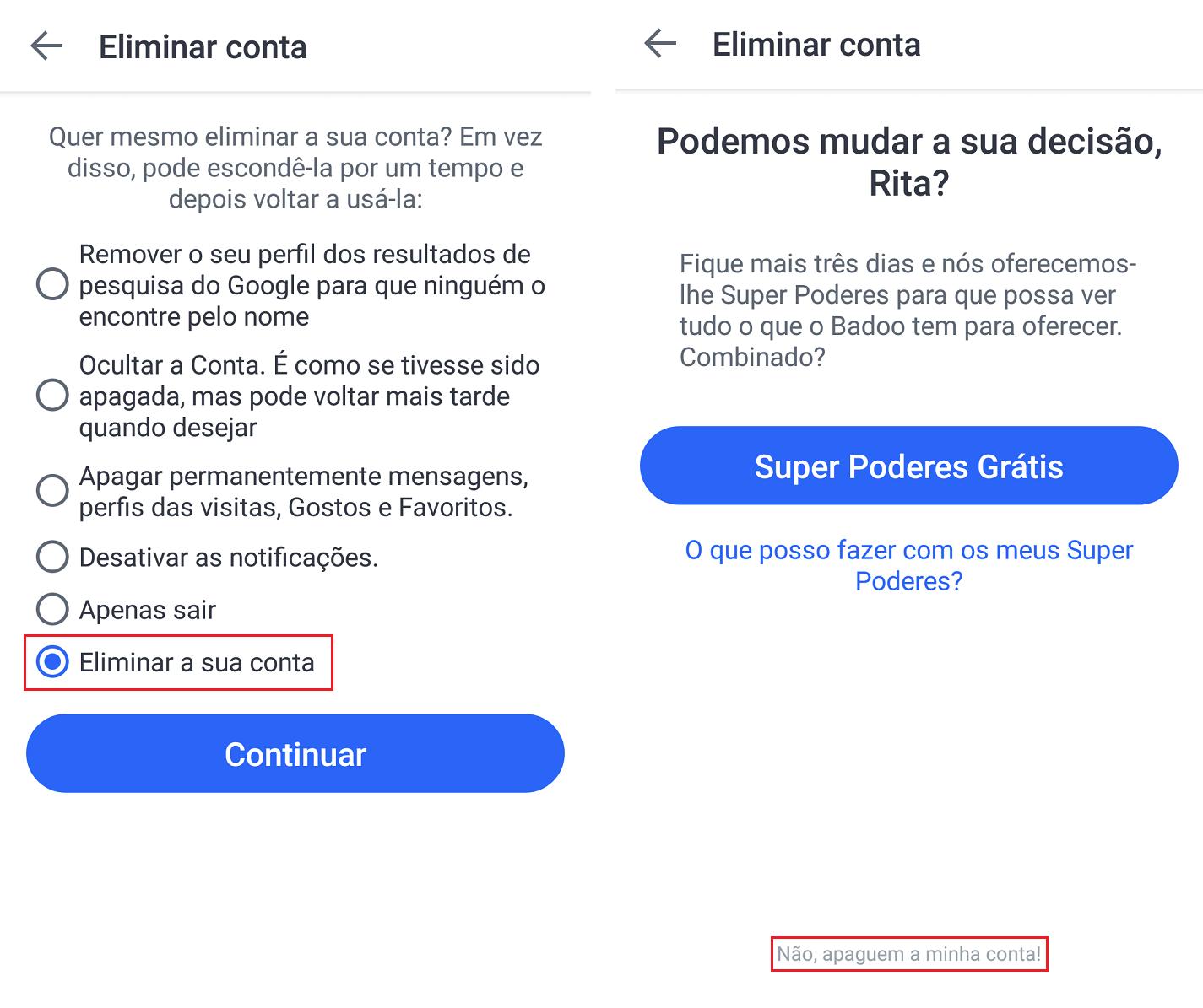 Em seguida, marque a opção "Deletar sua conta" e clique em Continuar. Na tela seguinte deverá clicar em "Não deletem minha conta".