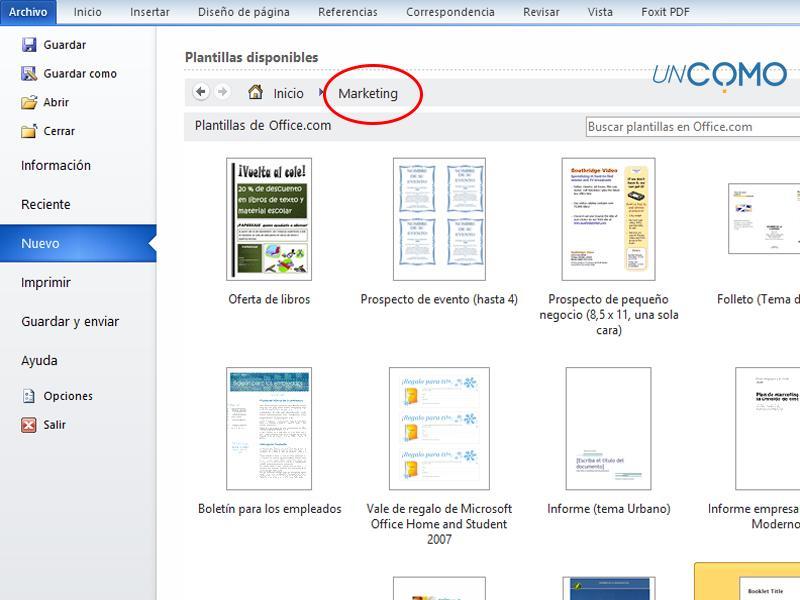 - Como já dissemos, você pode abrir um novo documento ou selecionar um modelo predefinido. Para utilizar um modelo predefinido, selecione "Arquivo"> "Novo"> "Panfletos". Você pode encontrar esta opção em "Arquivo"> "Novo"> "Pasta de marketing". Nessa pasta, você encontrará diferentes tipos de panfletos predefinidos;