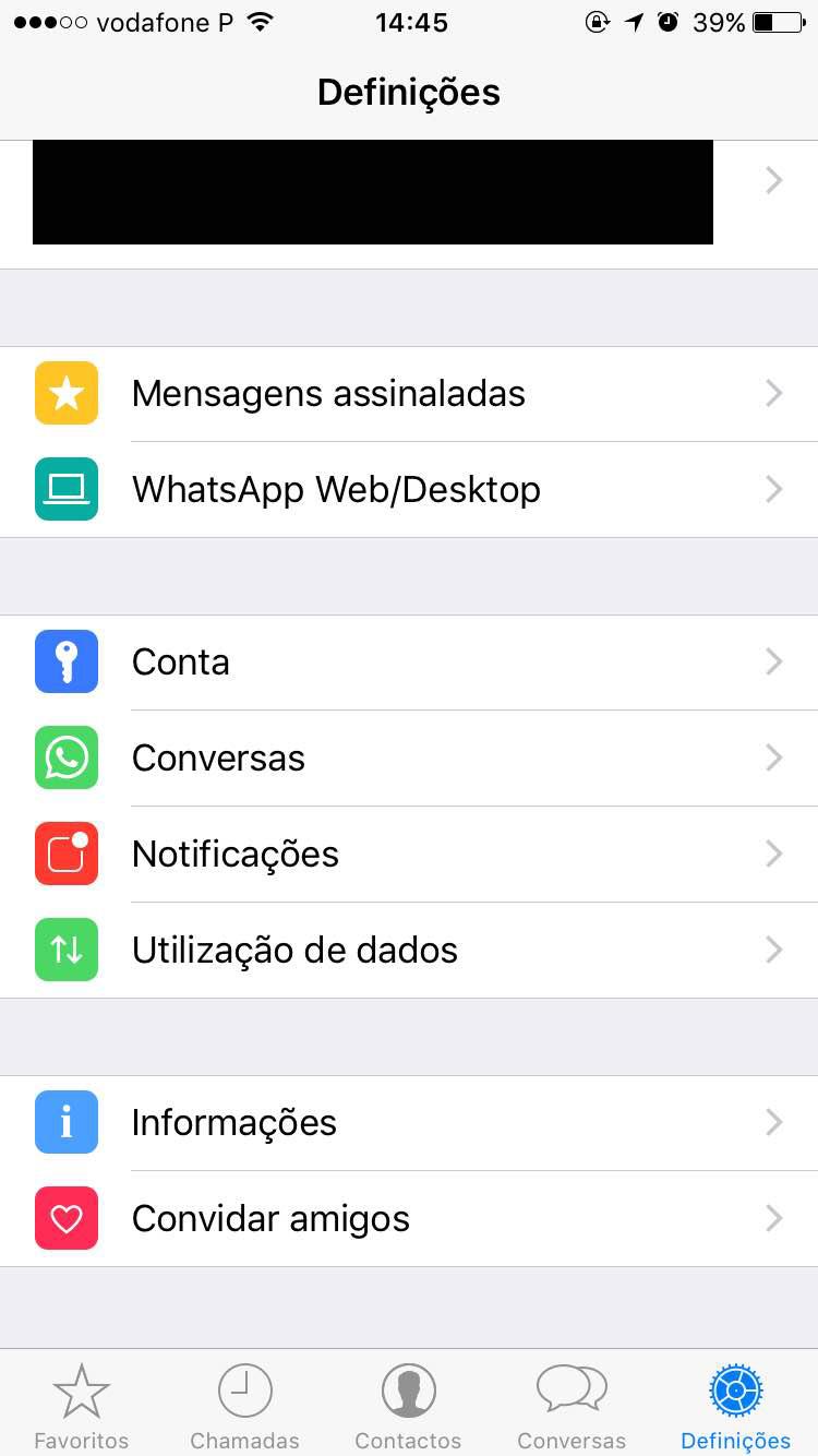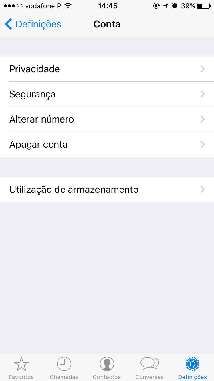 Dentro do menu das Configurações tem de clicar no separador de Conta. É nesse separador que se encontram as opções relativas à privacidade e, onde temos de mudar algumas configurações de forma a não aparecermos online quando utilizamos o WhatsApp.