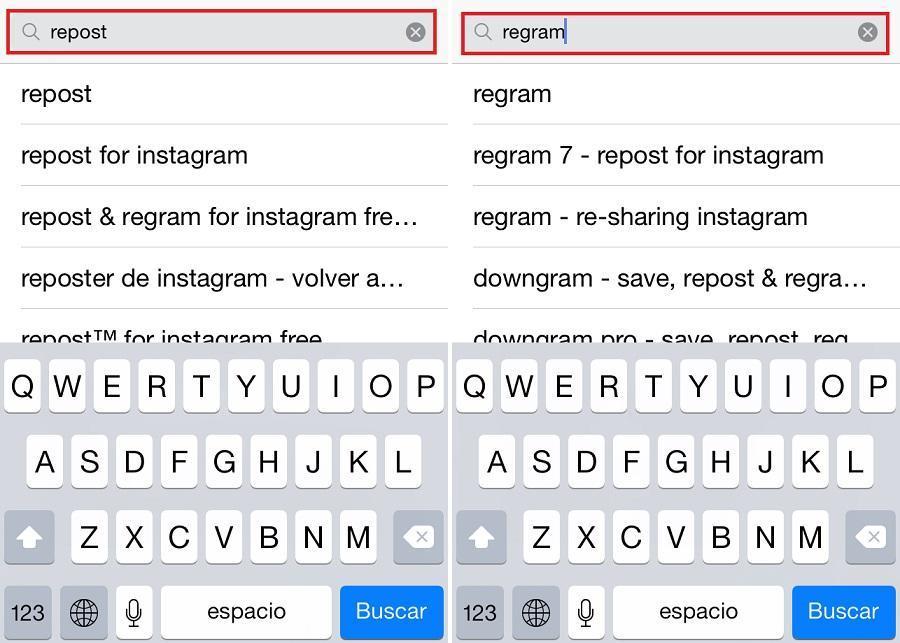 O primeiro a fazer é baixar o aplicativo. Para isso, abra a AppStore ou Google Play e insira na barra de busca a palavra 'repost'. No iPhone, você também pode inserir o termo 'regram', aparecerão outros aplicativos. No Android, independentemente da palavra-chave que você procurar, aparecerão os mesmos aplicativos.