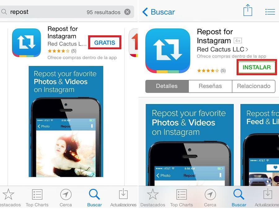 Você verá que aparece uma lista com vários aplicativos, você pode baixar o que quiser, já que todos cumprem a mesma função, compartilhar fotografias. Nós vamos baixar o 'Repost for Instagram', já que está disponível tanto para Android como para iOS. Clique sobre o aplicativo e instale-o.
