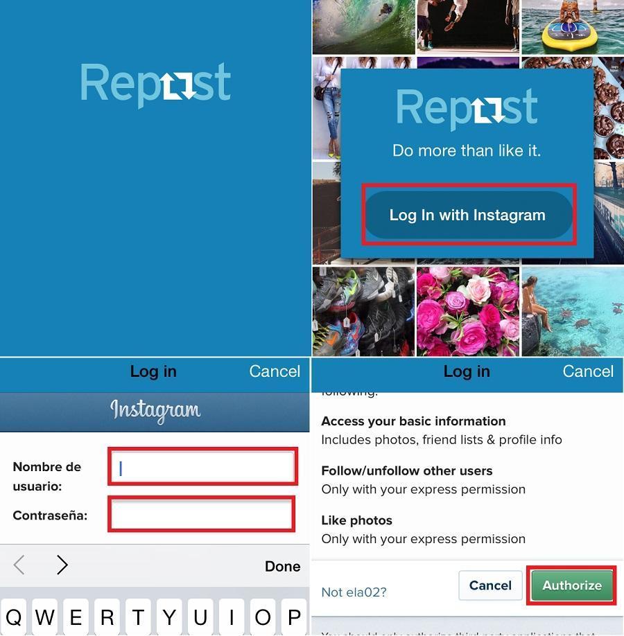 Uma vez instalado em seu equipamento, abra-o. Você verá que aparece a aba de 'Log in', deverá clicar nela e iniciar sessão com seu nome de usuário e senha do Instagram. Independentemente do aplicativo que tiver baixado, o procedimento é o mesmo. Aparecerá uma janela com as condições de uso, leia-as e aceite-as clicando em 'Autorized'.