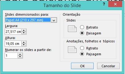 E então, a proporção desse slide será alterada para a de um papel A4. Clque em OK. E mantenha as configurações do slide para papel A4.