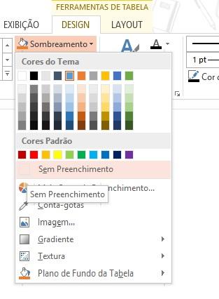 Agora será necessário corrigir a cor da tabela para que fique ou branca ou da cor que preferir. Neste caro iremos deixá-las brancas. Para que as colunas fiquem brancas, é preciso ir em Ferramenta de tabela -> Design -> e selecionar a opção Sem preenchimento. Se preferir que as colunas tenham cor, selecione a cor que você preferir.