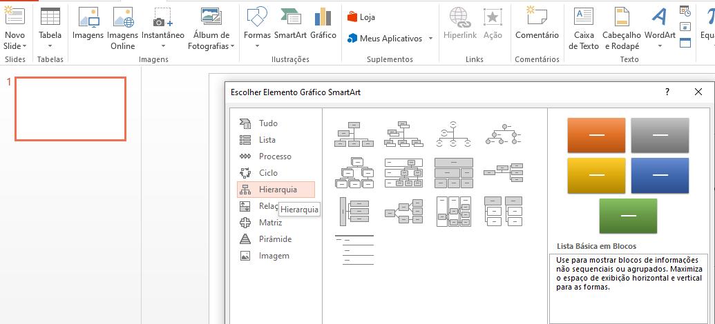 - Na barra de opções, encontre e selecione SmartArt e, após, Hierarquia;