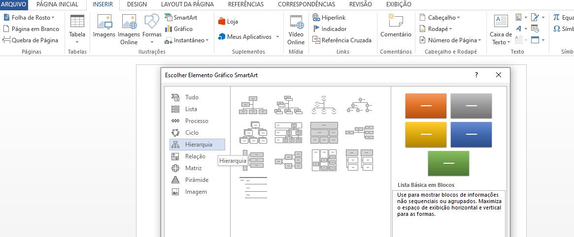 - Vá em Hierarquia e selecione o tipo de organograma que deseja fazer. O Word irá de mostrar imagens com a estrutura de cada opção para facilitar a escolha.
