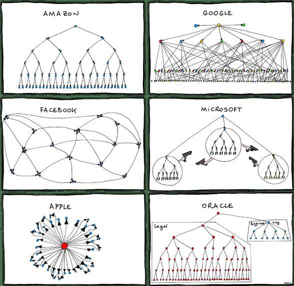 Apesar dos tipos de organograma, muitos deles fogem dos modelos mais conhecidos e se adaptam à natureza de cada empresa. Um bom exemplo disso é a ilustração publicado pelo cartunista e programador do Google Manu Cornet. Estes são os organogramas de algumas das empresas mais famosas do mundo, com um toque de humor e criatividade, de acordo com a visão dele: