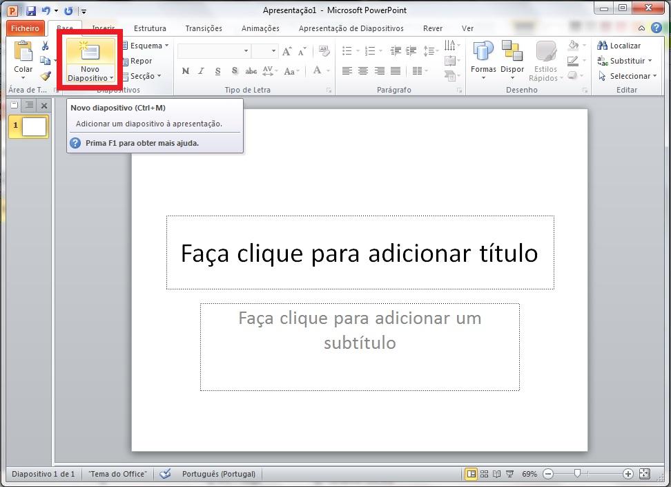 Acrescente um novo diapositivo clicando em "Novo diapositivo", na área de ferramentas acima do diapositivo que está visualizando.
