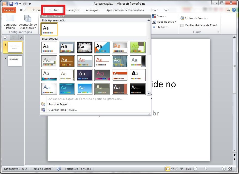 Quando tiver terminado de inserir toda a informação, pode mudar o aspeto de seu slide adotando um tema. Para isso, clique na aba "Estrutura" e escolha um a seu gosto. É normal que o tipo de letra e a localização do texto mude de sítio, mas você poderá configurar isso.