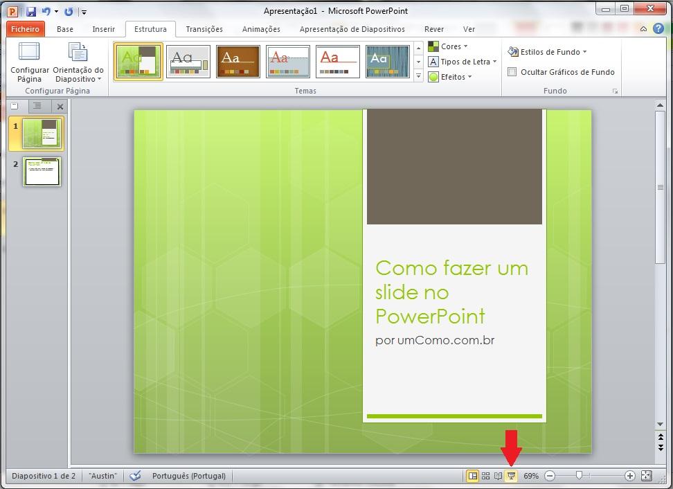 Está satisfeito com o novo aspeto dos seus diapositivos? Confira todos os detalhes e prepara-se para visualizar seu slide. Para isso, no canto inferior direito da janela do PowerPoint, junto ao zoom, carregue no símbolo indicado, que será o quarto desse conjunto de símbolos. Para avançar nos diapositivos, simplesmente clique "Enter" ou na seta para baixo, em seu teclado.