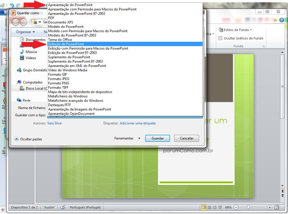 Por fim, guarde sua apresentação clicando "Ficheiro", depois em "Guardar Como" e selecionando o local de armazenamento e o nome. Pode ainda guardar sua apresentação em um formato pronto a visualizar em modo slide, como no ponto anterior. Para isso repita o processo de guardar mas, na janela em que escolhe o local de armazenamento e o nome, clique no tipo de ficheiro "Exibição de PowerPoint". No entanto aconselhamos que guarde sempre seu slide em modo "Apresentação de PowerPoint", que é o predefinido assim que o guarda a primeira vez, de forma a poder mais tarde efetuar alterações nele.