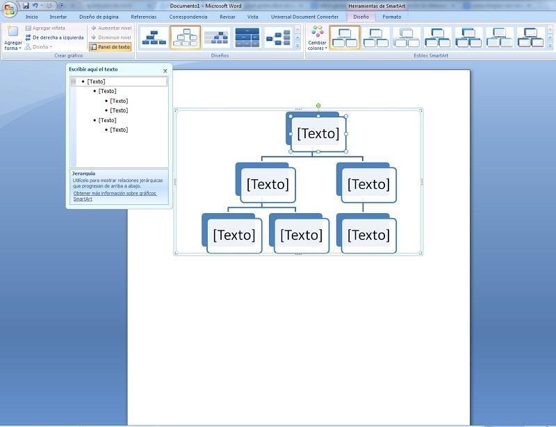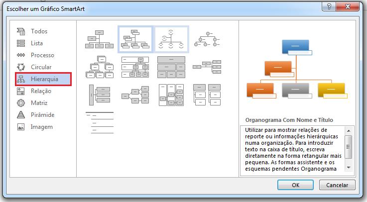 - Aparecerá uma janela do SmartArt em que deve escolher o gráfico que pretende desenhar. Escolha "Hierarquia".