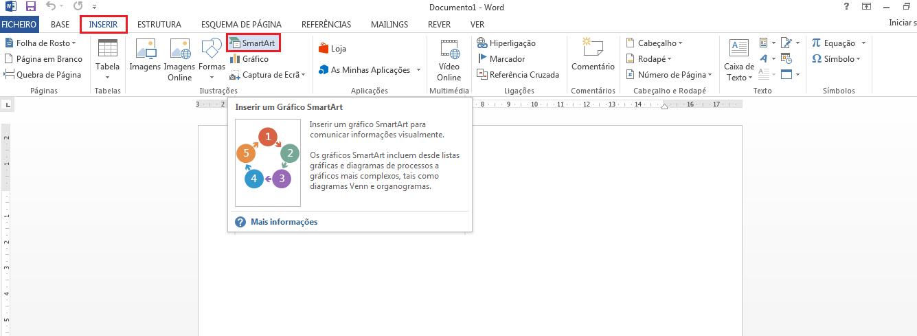 - Abra o Word e, no canto esquerdo superior, clique em Inserir > Ilustrações > SmartArt.