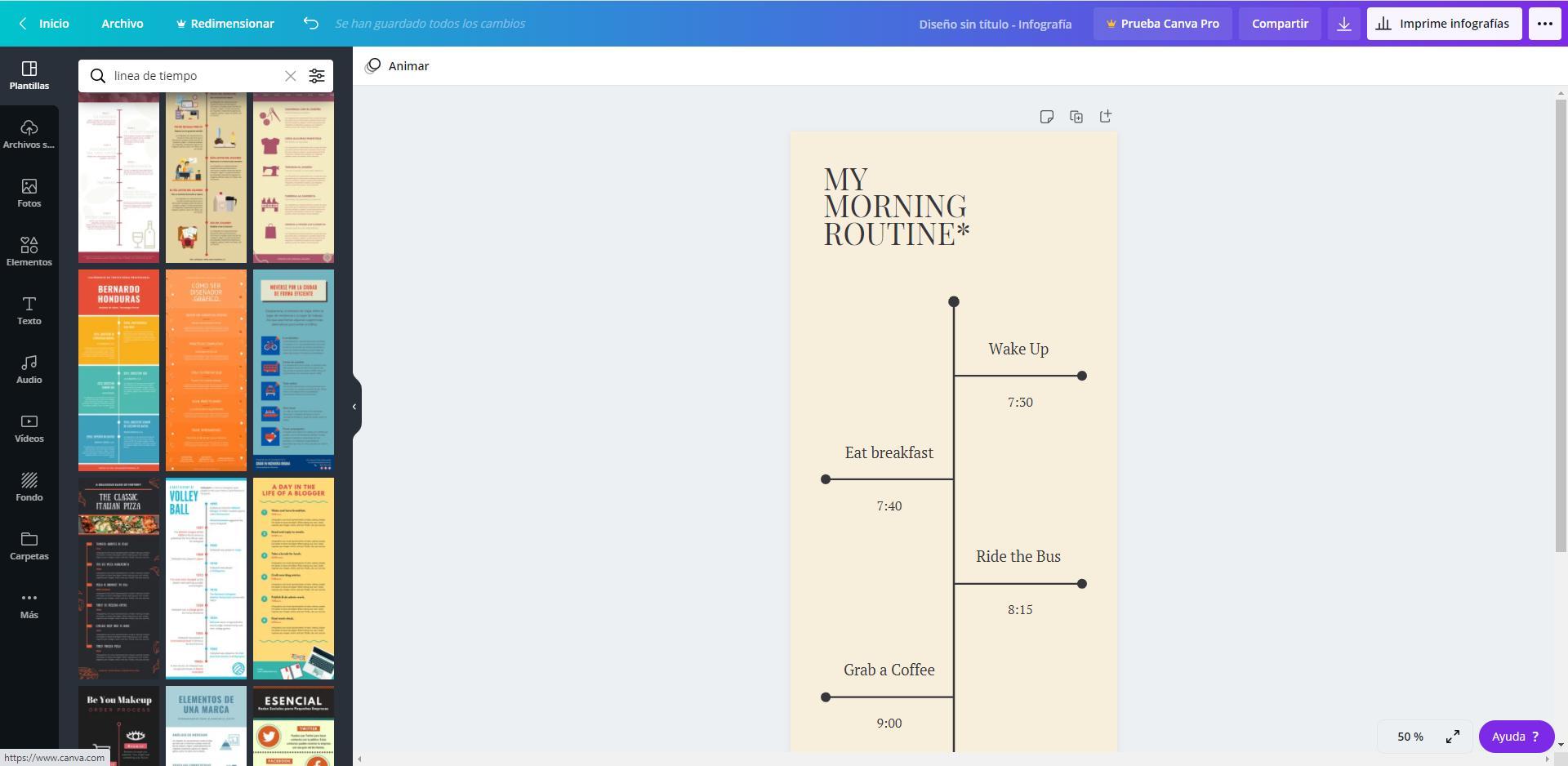 - Escolha o modelo que melhor se adapte ao que você procura. O "My morning routine" é ideal para o tipo de gráfico que você quer criar, por exemplo. Essa linha do tempo é mais estética e seus elementos já foram projetados, por isso é muito mais fácil de criar do que em outro qualquer programa.