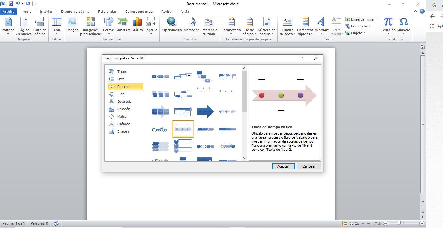- Na janela que aparecer, selecione Processo na coluna à esquerda. Escolha o diagrama que melhor se adapta às suas necessidades e clique em OK. Alguns dos que você pode usar são a linha do tempo com círculos ou a linha do tempo básica.