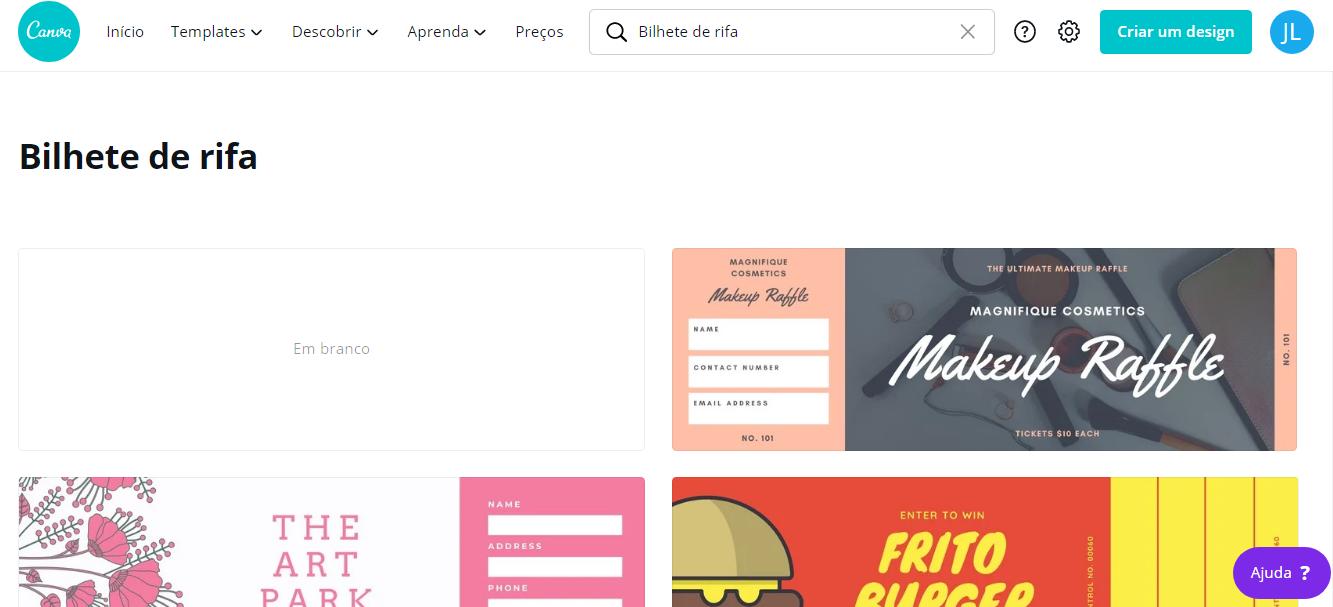 Se você vai organizar uma rifa com bilhetes físicos e quer confeccioná-los online, também é possível. Você pode criar bilhetes de rifa online através de programas e aplicativos que já te passam o template pronto, basta preenchê-lo. O site Canva é uma das opções mais conhecidas neste quesito: