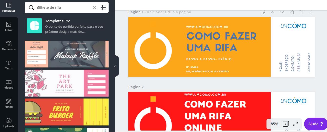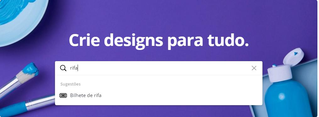 - Para fazer os bilhetes de rifa online, acesse o site (canva.com), faça o login e na barra de pesquisas procure por 'rifa';