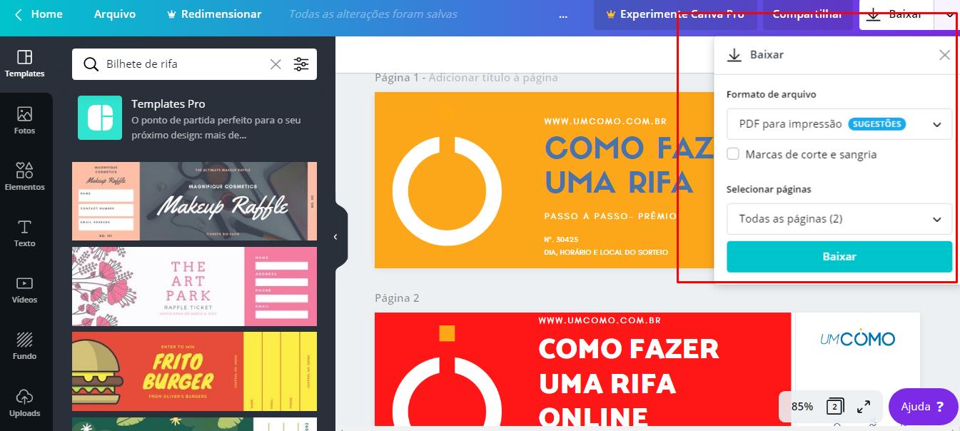 - Para imprimir, bastas selecionar a opção 'baixar' no canto superior direito da tela e escolher 'PDF para impressão'. Depois, você só precisa imprimi-los do seu computador e organizar a rifa, segundo as dicas passadas anteriormente.
