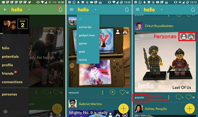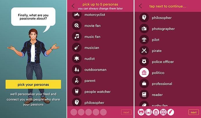 A funcionalidade Personas trabalha com as áreas de interesse dos usuários. Principalmente aquelas com que mais se identificam. São mais de uma centena, e dos mais variados temas, desde esporte ao manga, passando pela tecnologia e a fotografia. No momento apenas pode escolher 5 mas pode ir alterando conforme a sua utilização da Hello, sabendo que o limite será sempre cinco.