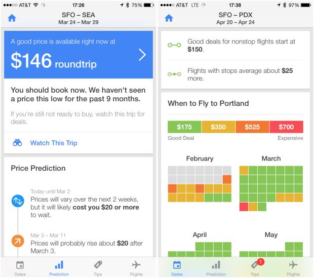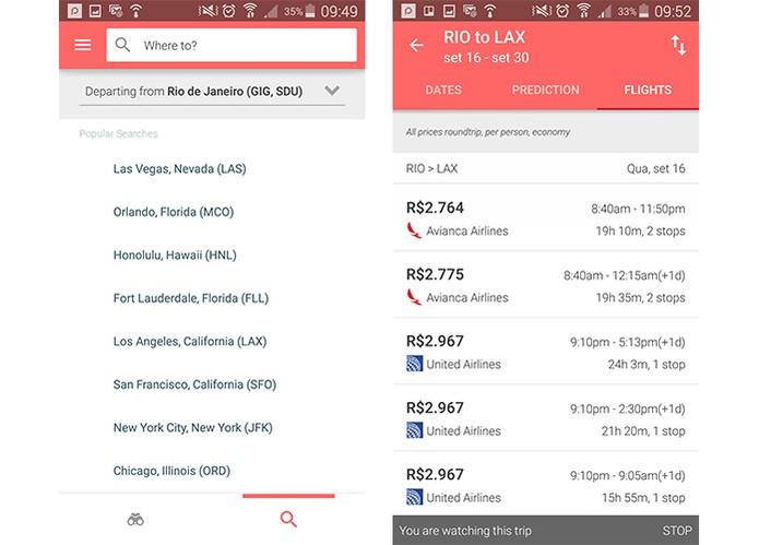 Mas a novidade deste aplicativo está na aba Prediction, que lhe mostra o preço mais baixo no momento e oferece sugestões dizendo se será melhor comprar agora as passagens aéreas ou esperar. Nesta aba você pode ativar a opção "Watch this Trip" para receber notificações sobre quando os preços estão mais baixos e quando o app Hopper pensa que vão subir para o percurso e datas selecionadas.