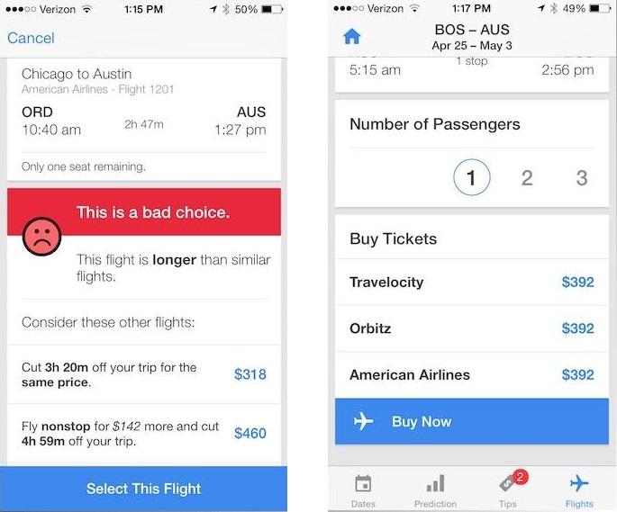 Por último, na aba Flights o Hopper mostrará ao usuário os diferentes voos disponíveis para as datas selecionadas. Uma vez que indique as datas e o destino e origem da sua viagem, o Hopper dá-lhe um feedback dizendo se fez uma boa escolha ou sugerindo melhores alternativas para conseguir comprar as passagens mais baratas. Depois de fazer a sua escolha, o aplicativo também lhe permite fazer a compra das passagens.
