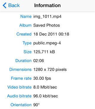 Ao clicar em mais informações, você poderá consultar todos os dados do seu vídeo: nome, álbum em que se encontra, data de criação, formato, tamanho, duração, dimensões, frame rate e orientação. Use isso para saber se você fez a escolha certa quanto à orientação do vídeo.