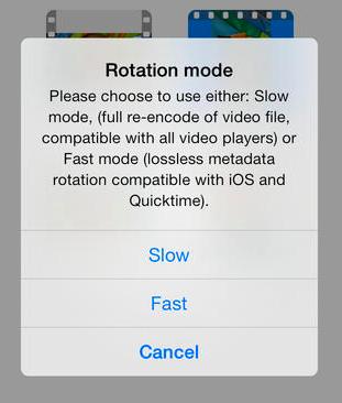 Ao determinar quantos graus você quer girar seu vídeo, o aplicativo irá abrir uma janela explicando o “Modo de rotação”. Você deverá escolher entre: “slow” (compatível com todos os players de vídeos, irá girar cada frame do vídeo); “fast” (haverá perda de dados na rotação, fazendo com que se torne compatível apenas com o Quicktime).