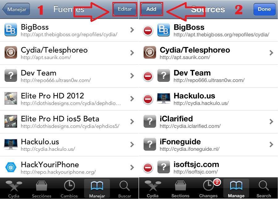 Agora pressione sobre 'Sources' ou 'Fontes'. Para inserir o repositório da página que lhe permitirá instalar AppSync, clique em 'Edit' ou 'Editar', acima à direita, e 'Add' ou 'Adicionar'.