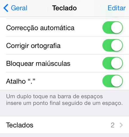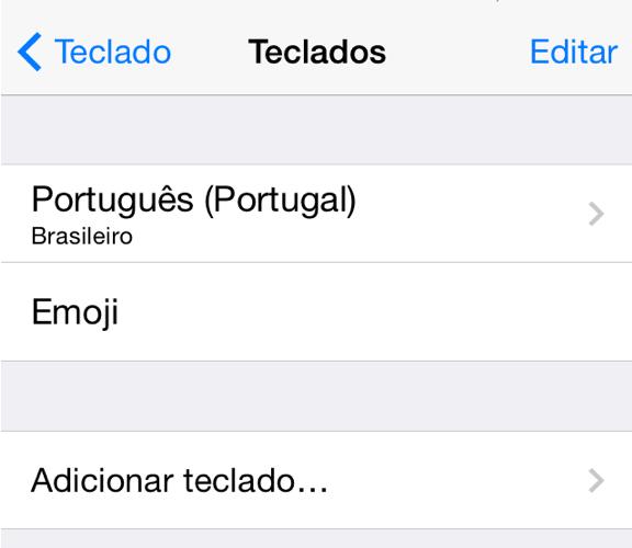 Depois deverá acrescentar um novo teclado, verá que aqui tem os idiomas em que configurou o seu iPhone.