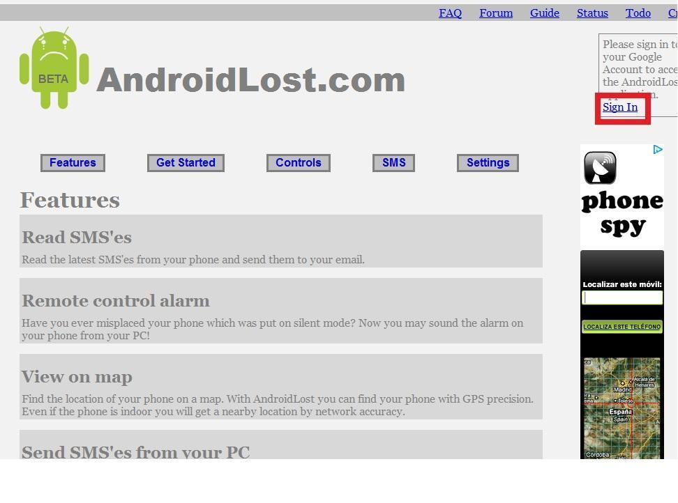 Uma vez instalada a aplicação do Android Lost, tem que entrar na seguinte página: AndroidLost.com e faça clique em 'sign in'.