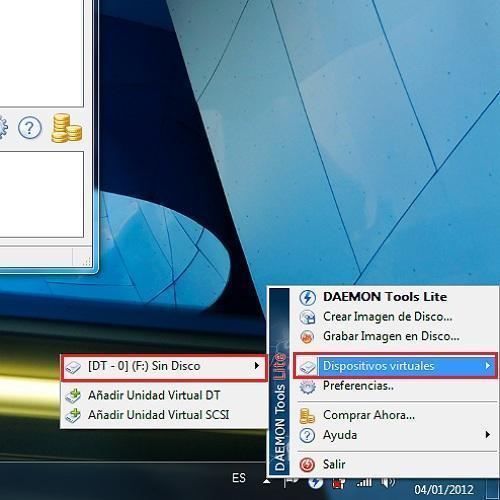 Execute Daemon Tools e vá para a sua barra de ferramentas, onde você verá o ícone do programa, como mostrado na imagem. Clique no botão direito em cima deste, selecione "Dispositivos Virtuais" para, em seguida, pressionar '[DT-0] (F :) Sem disco e faça clique em" Montar Imagem ".