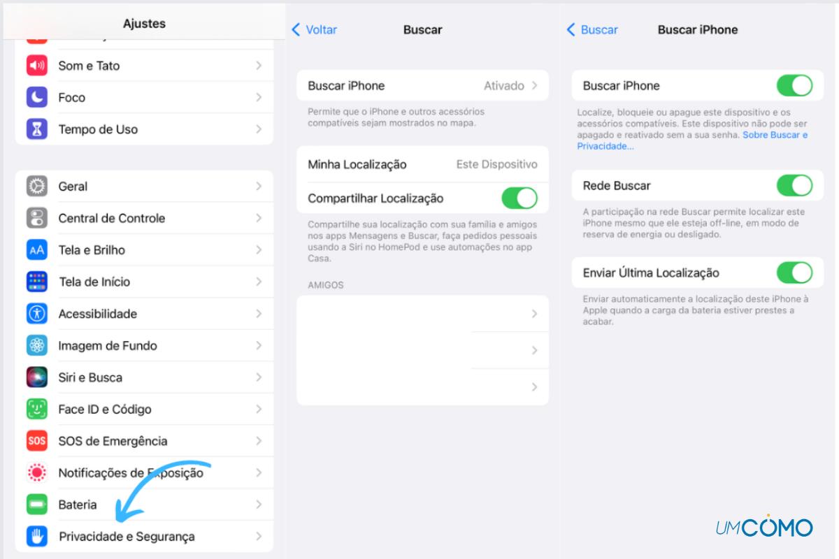 Você pode acessar o Buscar do seu iPhone através do iCloud ou através do controle de privacidade. Confira o passo a passo.