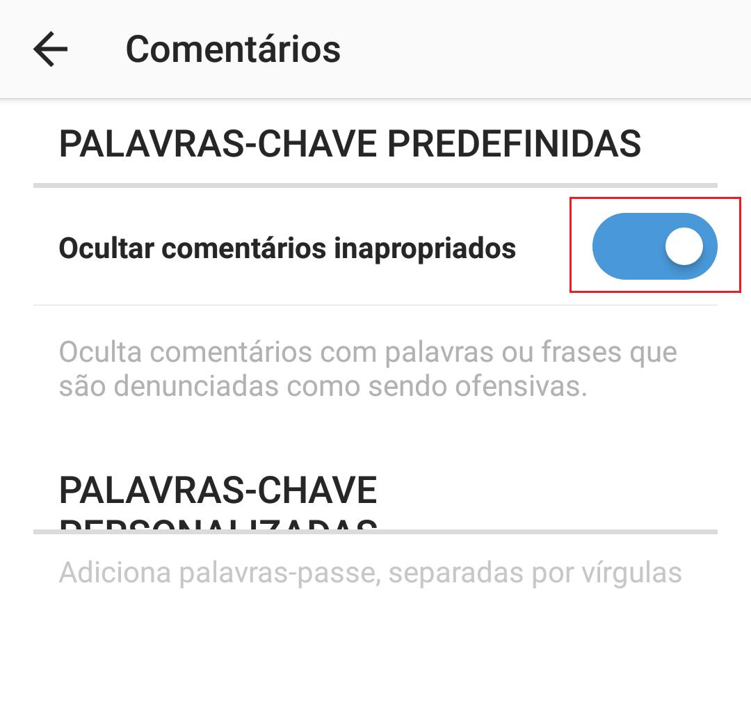 Agora basta apenas ativar a opção "Ocultar comentários inapropriados", de maneira a que a barra fique azul e, escrever no respetivo campo as palavras-chave que você considera inadequadas ou ofensivas e não pretende que apareçam nos seus posts nos comentários. Você deve escrever as palavras separadas por vírgulas e pode adicionar qualquer palavra, palavrão ou não, em diferentes idiomas.