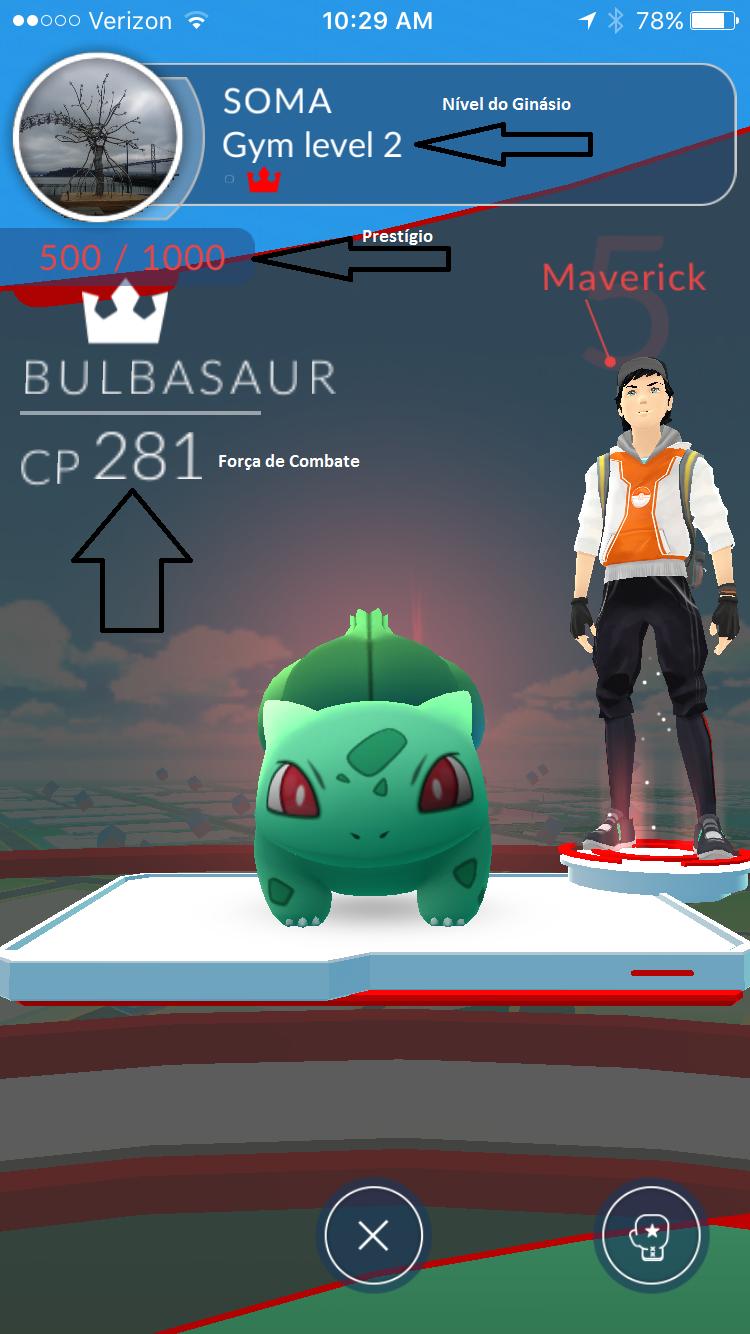 Quando entra num ginásio de cor inimiga, vai poder verificar qual o nível do ginásio, quem está guardando ele, os Pokémons e o CP deles (força de combate). Aviso, mesmo tendo um Pokémon de CP elevado nesse jogo vai acabar por perder algumas senão muitas vezes, mas não se preocupe, faz parte.