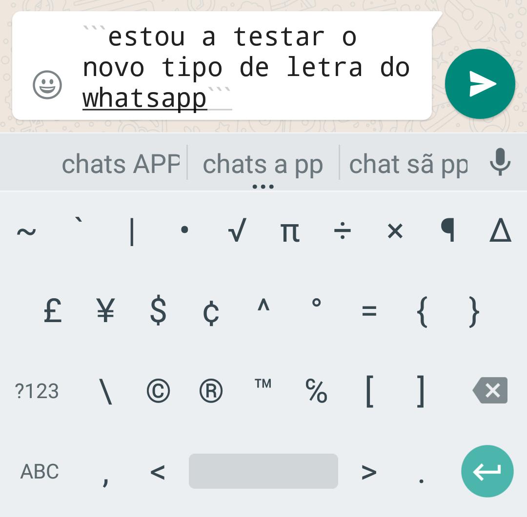 Para conseguir mudar o tipo de letra no WhatsApp deverá apenas abrir o aplicativo e entrar em qualquer uma das mensagens que já tiver abertas. Entre em uma delas e, quando for escrever a mensagem digite três acentos graves (`) no início do texto e feche-o com outros três acentos graves no final (`).