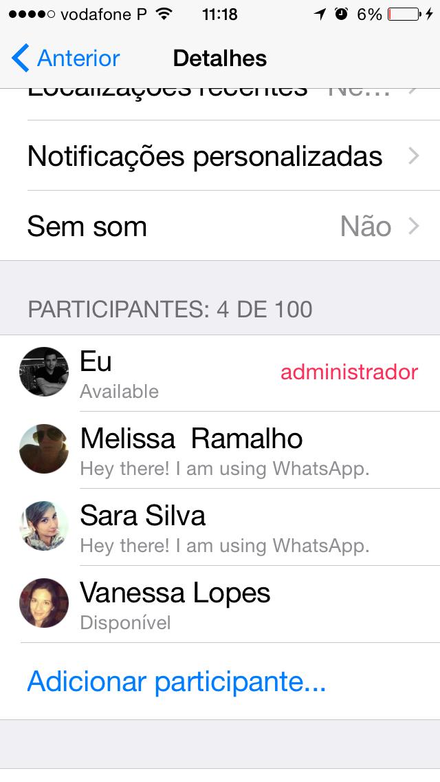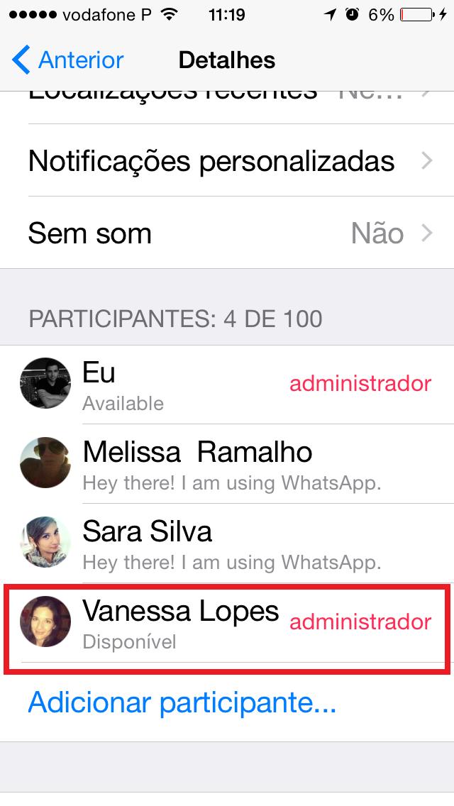 Poderá ver a todos os participantes desse grupo. Desta lista selecione a pessoa que deseja que seja o administrador do grupo de Whatsapp.
