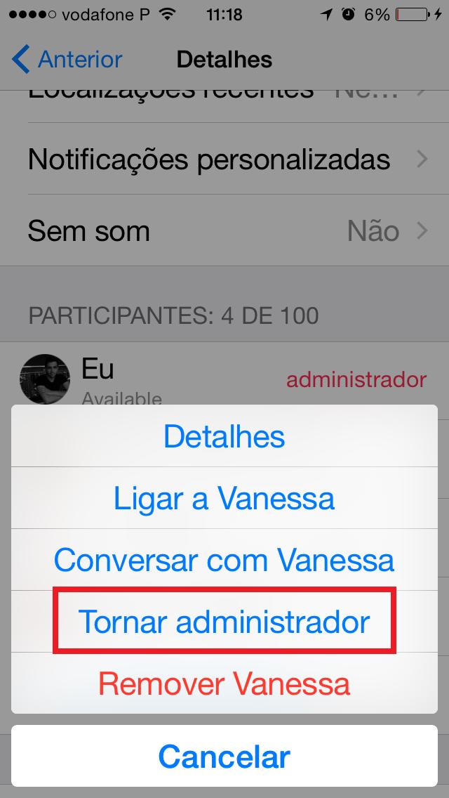 Ao selecionar o participante irá se abrir outro menu. Escolha a opção: "Tornar administrador". Pronto! Em um abrir e fechar de olhos conseguirá mudar o administrador de um grupo de Whatsapp e ter alguém mais que ajude a gerenciá-lo.