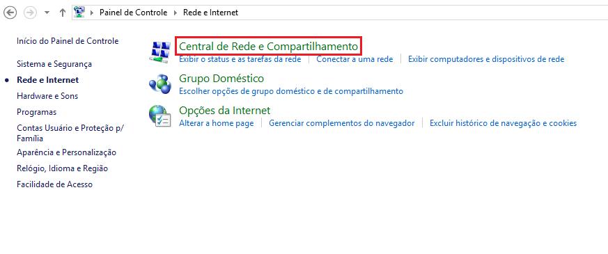 A seguir, vá até o "Centro de rede e compartilhamento" para acessar à configuração de suas redes e conexões à Internet e poder trocar o DNS do seu computador.