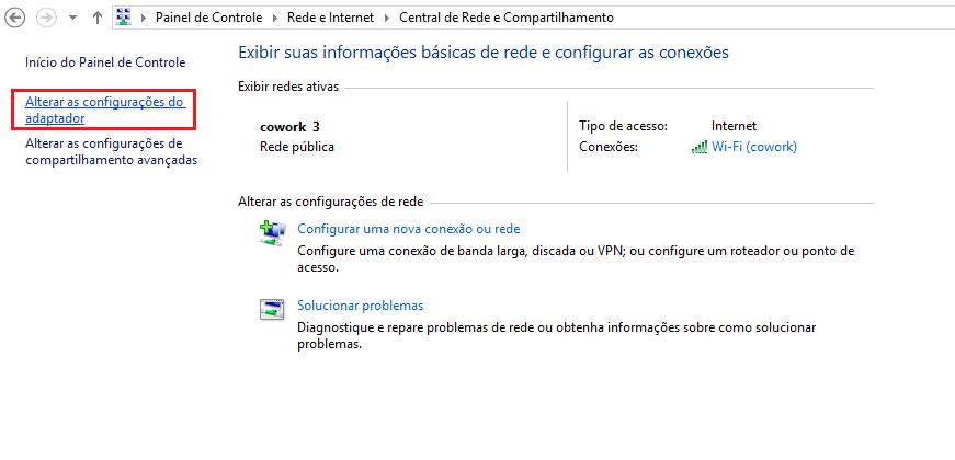 O seguinte passo será acessar, através do menu da parte esquerda, à opção "Alterar as configurações do adaptador" e neste momento aparecerá uma nova janela.
