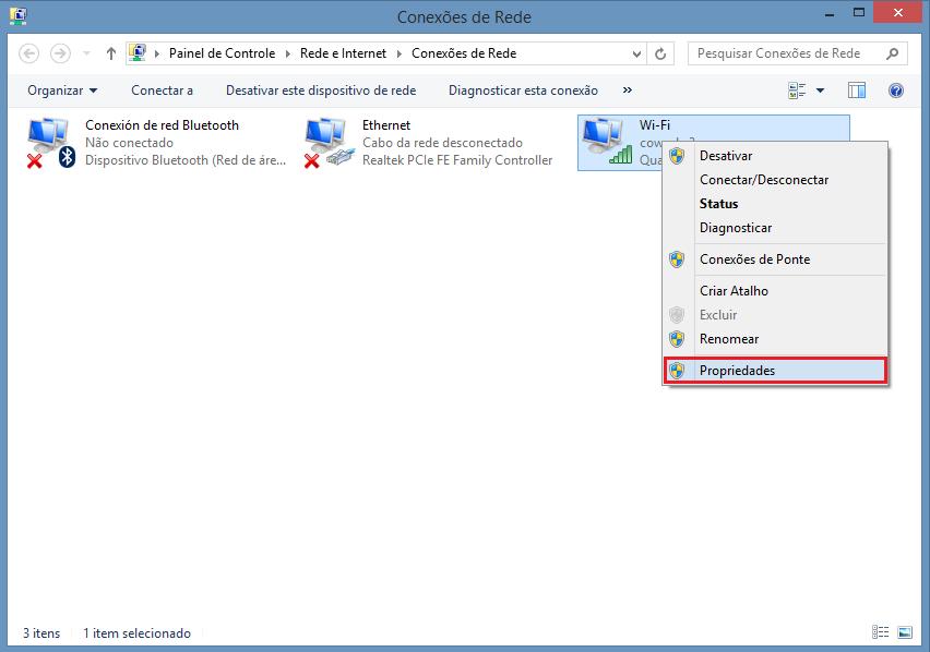 Na nova janela deverá escolher a conexão que está usando, ou seja, se está conectado por cabo ou através de uma conexão sem fio. No nosso caso, estamos conectados sem fio, por isso clicaremos com o botão direito sobre o ícone de Wi-Fi e selecionaremos a opção Propriedades.