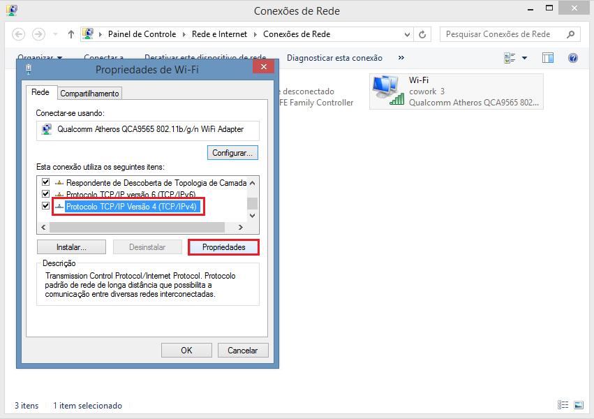 Destaca-se que, se for tentar mudar o DNS para uma versão de Windows XP ao invés de Windows 8, deverá acessar o "Protocolo TCP/IP".